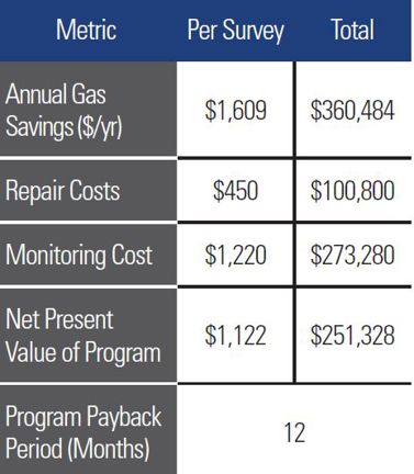 $1,609 per year, and the average lifetime of a repair is two years. Applyingnet present value with a 10 percent discount — a method of comparing the present value of money spent to the value it would have in the future if it were invested — to the value of the gas saved yields a benefit of $1,122 per survey. (See Table 1.)