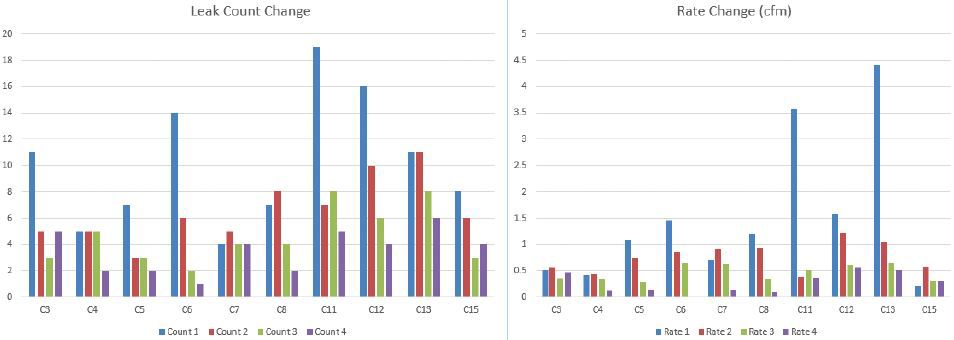 in the leak count between surveys was a drop of 18 percent, with an average drop of 23 percent for the leak rate. That could vary widely among facilities, however. The largest count increase between surveyswas 1,066 percent, and the largest rate increase was 3,800 percent. At the other extreme, the largest count decrease was 90 percent and the largest rate decrease was 96.9 percent. Only 5 percent of the leaks recurred. (See Figure 1.)