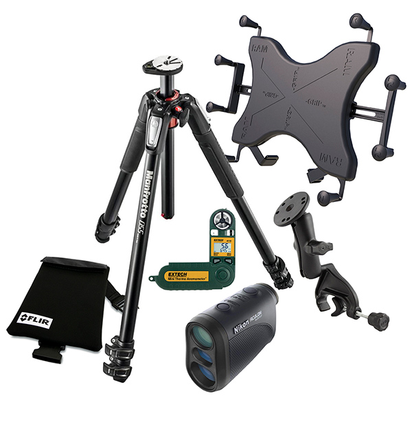 Field kit for the FLIR QL320 Quantitative OGI Tablet, which includes a Manfrotto tripod, Nikon laser rangefinder, Extech thermo-anemometer, RAM Universal X-Grip® cradle, RAM yoke clamp mount, and tablet pouch