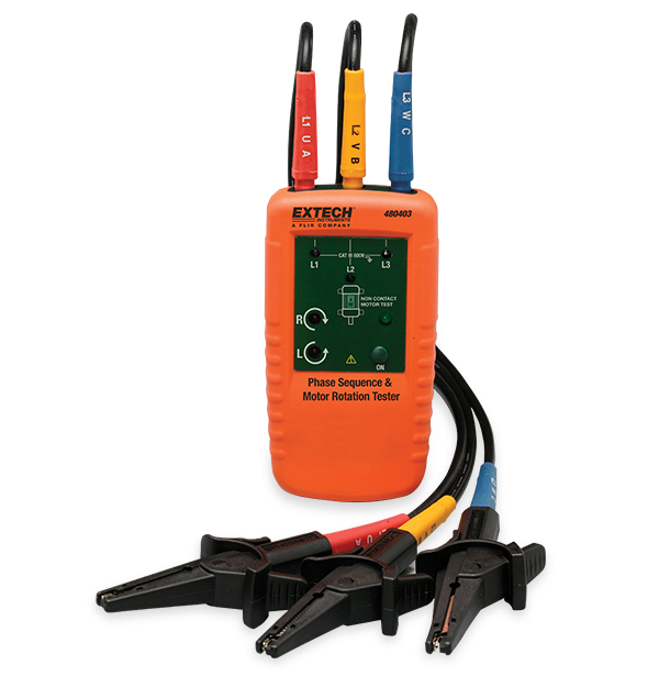 The Extech 480403 Motor Rotation and 3-Phase Tester has a 40 Volt to 600 Volt rated range for testing phase orientation of 3-phase power sources over a 2 Hz to 400 Hz frequency range. LEDs indicate phase orientation (clockwise or counter-clockwise) and whether each of the phases is live. In addition, it indicates rotation direction of the motor to ensure that it doesn't get damaged from incorrect wiring. Meter comes complete with cable and three large color coded alligator clips, pouch case, and 9V battery.