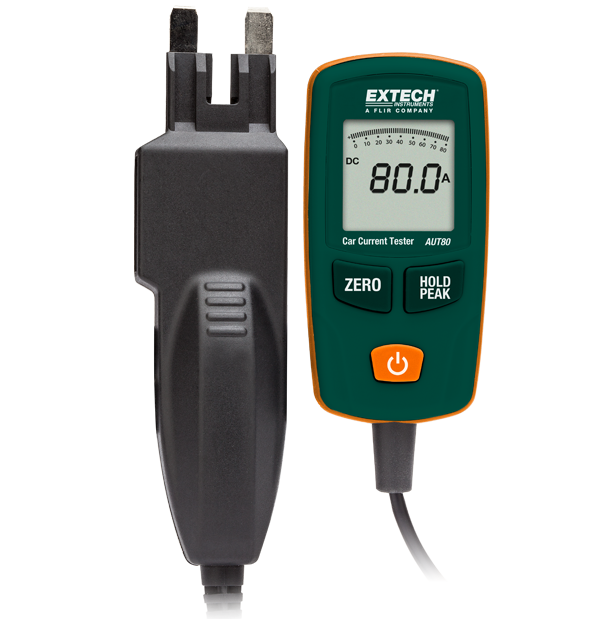 The Extech AUT80 checks up to 80 A without breaking the circuit. Mini, ATC, and Maxi blade connectors plug into the fuse block. It features a measuring range of 80 A/48 VDC (10 seconds, max) with 0.1 A resolution and (± 2% + 4 digits) accuracy. Results are displayed on a 3.5-digit LCD with bargraph. Includes one 9 V battery.
