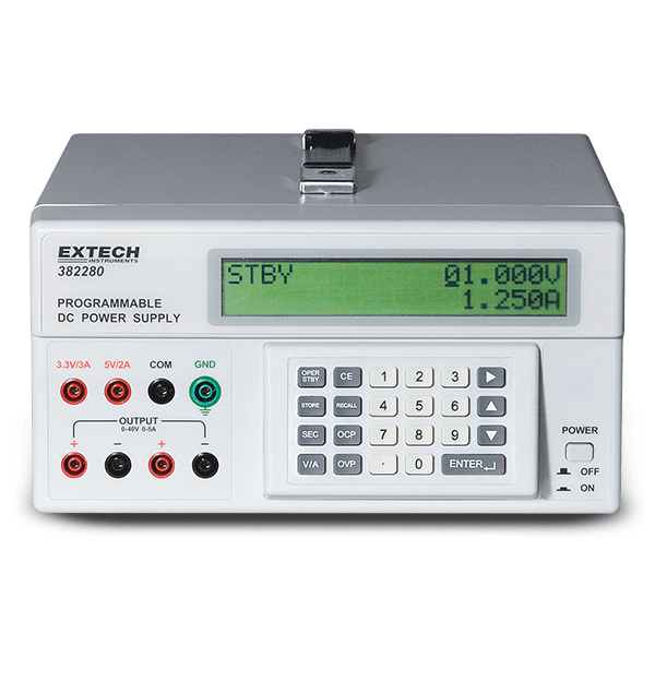 The Extech 382280 is a Programmable 200 Watt DC Power Supply that has an adjustable 40 V/5 A output, plus two fixed outputs (5 V/2 A and 3.3 V/3 A) and memory for 200 setups. It features high stability with low ripple and noise, 0 to 60 second programmable overload delay timer, selectable constant current/constant voltage, and a bi-directional PC interface that allows setup and read back using virtually any PC communications program.