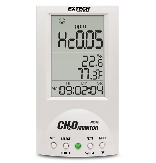 The Extech FM300 is a Desktop FFormaldehyde (CH₂O or HCHO) Monitor which measures formaldehyde concentration, air temperature, and humidity all simultaneously on an LCD monitor. The FM300 calculates statistical weighted averages of TWA (8 hour time weighted average) and STEL (15 minute short term exposure limit). It also features a min/max value recall function, CH₂O calibration function in fresh air, and an internal memory for manually storing up to 99 readings. Product comes complete with a universal AC adapter, multiple plugs, and a user's manual.