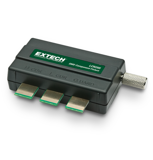The Extech LCR205 is an optional chip component fixture for use with LCR200 LCR Meter. The LCR205 is useful for testing tasks like impedance evaluations on SMDs. The unit features three terminals for high, low and guard, as well as an adjustment knob to secure measurement contacts to components being tested.