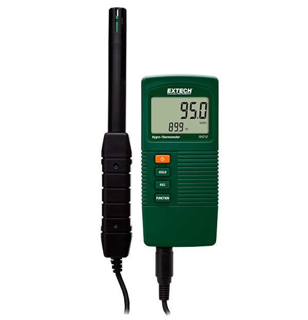 The RH210 is a Hygro-Thermometer that measures Relative Humidity, Temperature and Dew Point. This compact hydro-thermometer is ideal for many industrial or residential applications. Complete with probe and 39" (1m) cable, 9V battery and soft case.