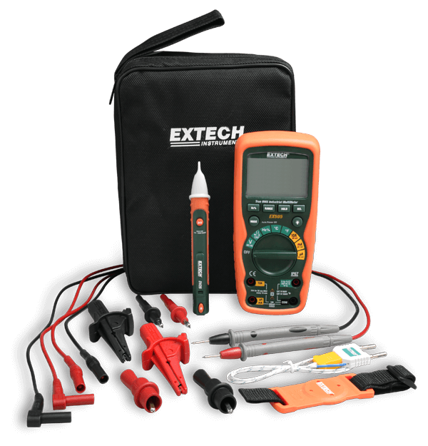 The EX505-K is a heavy duty industrial multimeter kit. The kit includes Extech’s model EX505, DV25 and TL808 products. Kit provides you with a reliable meter and all the necessary accessories for industrial electric troubleshooting. Products are supplied in a soft carrying case that provides protection and organization for the meters whenever they are needed.
