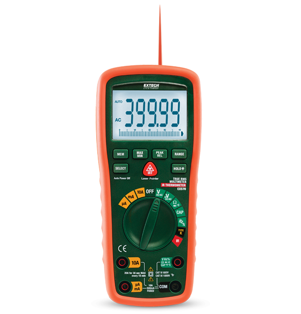 The rugged Extech EX570 is ideal for industrial/plant maintenance and electrical contractors. It offers advanced multimeter functions, high accuracy (0.06%), True RMS precision plus an integrated infrared thermometer patented by Extech. The EX570 protects users with category IV-600 V and category III-1000 V safety ratings. It measures voltage, millivolt, current, resistance, capacitance, and frequency plus diode and continuity tests. Added functions include min/max, average, hold, relative, peak hold, and quick note memory for 3 readings. Thermocouple temperature readings are complemented by an infrared thermometer for safe, non-contact temperature measurement (30:1 distance to spot ratio). Built in IR simplifies the identification of overheating motors, electrical panels, and other components from a distance and without a separate thermometer. Complete with double-molded test leads, temperature probe, magnetic hanging strap, 9 V battery, and case.