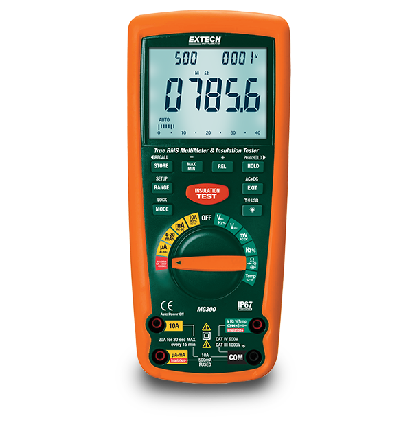 The Extech MG300 is a True RMS Multimeter with a built in insulation resistance tester that features wireless data streaming for remote monitoring and datalogging. By adding insulation testing capabilities to the ubiquitous digital multimeter, electricians are always equipped for insulation testing. This feature helps make the MG300 a more routine part of predictive maintenance with faster troubleshooting and repairs without additional tools. The rugged and waterproof (IP67-rated) combination meter includes a digital insulation resistance tester (or megohmmeter) with 4 different test voltages for measuring resistance up to 4G Ω with 0.001 MΩ resolution. Complete with remote receiver with USB cable, windows compatible software, heavy duty test leads, alligator clip test lead, Type K bead wire temperature probe with adapter, carrying case, and 6 AA batteries.