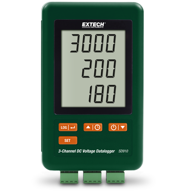 Extech's SD910 allows technicians to easily monitor and record DC mV values from 3 external sensors, transducers, and other sources, all using one meter. It also stores the time and date of when readings are taken. The logger features a large triple LCD display and records data on an SD card in an Excel®-ready format for easy transfer to a PC for analysis, trending, and archiving. Complete with six AAA batteries, SD memory card, univeral AC ddaptor with multi-plugs (US, EU, UK, AUS), 3 input connect sockets, and mounting bracket.