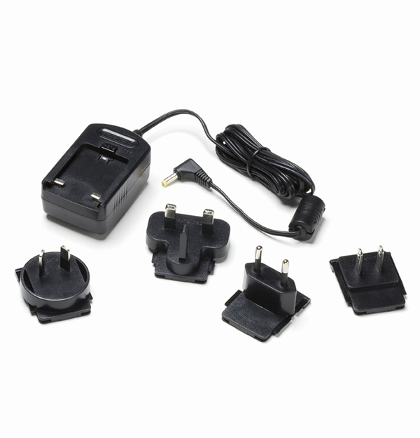 Combined power supply & battery charger with EU, UK, US, and AU plugs.