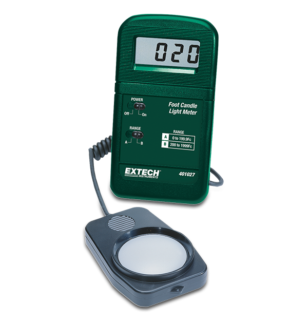 The Extech 401027 is a Pocket-Size Foot Candle Light Meter featuring measuring ranges of 200 Fc and 2000 Fc with a maximum resolution of 0.1 Fc. The 401027 is simple and intuitive to use and has a built-in stand. Comes with sensor and 1.2 m (47 in) coiled cable.