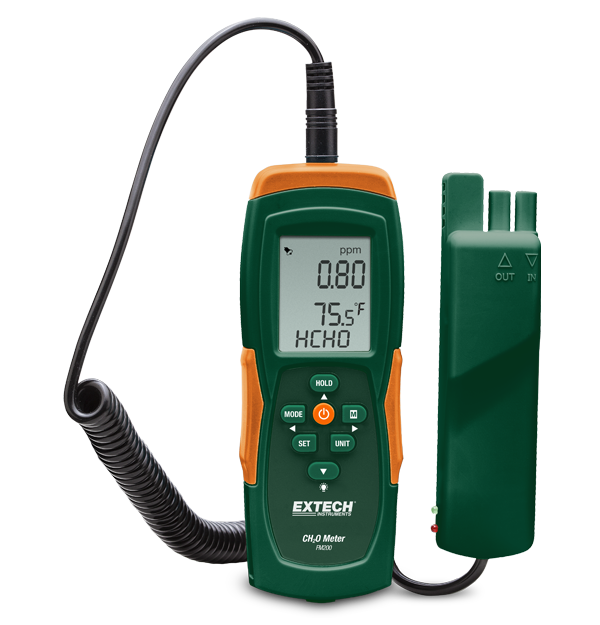The Extech FM200 is a handheld Formaldehyde Meter with a detachable probe. This meter simultaneously displays formaldehyde (CH₂O) concentration, air temperature, and relative humidity readings on a large, LCD backlit display. The FM200 features CH₂O calibration function in fresh air, min/max, data hold, auto power off, and low battery indicator functions. Comes complete with a soft tube, sensor with a 64 cm (2.1 ft) cable, 6 AAA batteries, user's manual, and a carrying case.