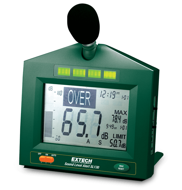 The Extech SL130G is a Sound Level Alert with Alarm for continuous monitoring of sound levels. It can be ideal for industrial, hospital, auditoriums, schools or other areas where there is a need for being alerted when sound level reaches set points. Bright LEDs (red flashing or green) alert the user when a sound level is too high or too low. You can set the SL130 so the red LEDs flash when the sound level is below the"LO" set point where people in the audience may not be able to hear. When the sound level is above the "LO" set point, the green LEDs indicate the sound level is acceptable. You can reverse the red and green LEDs activation per user color preference. It is wall, desk, or tripod mountable with the optional 5 m (15 ft) microphone extension cable. It has a user settable high or low limit (30 dB to 130 dB) with an output to drive the external relay module. The SL130G meets ANSI Type 2 and EN 60651 accuracy specs and is compliant to OSHA. Complete with 100 V-240 V AC 50 Hz/60 Hz adapter and microphone wind cover. 8 AA batteries (not included) can be used for monitoring function only without the LED alert.