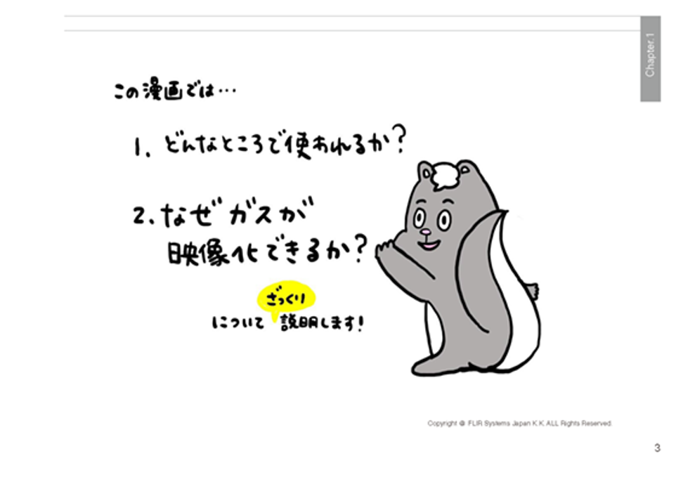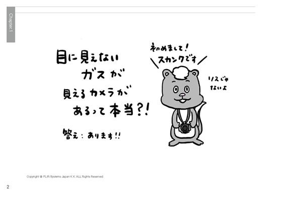 FLIR オリジナルキャラクター『スカンク』が『ガス検知』におけるサーモグラフィの活用方法や注意点を分かり易く解説します。