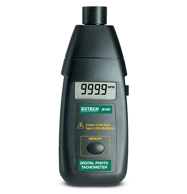 With the 461893, you can make non-contact RPM measurements (5 to 99,999 RPM) of rotating objects by pointing the integral light beam (6 in. target distance) at reflective tape placed on the object to be measured. The memory button holds last reading and recalls min/max readings display. Comes with 4 AA batteries, 23 in. (0.6 m) reflective tape, carrying case, and user manual.