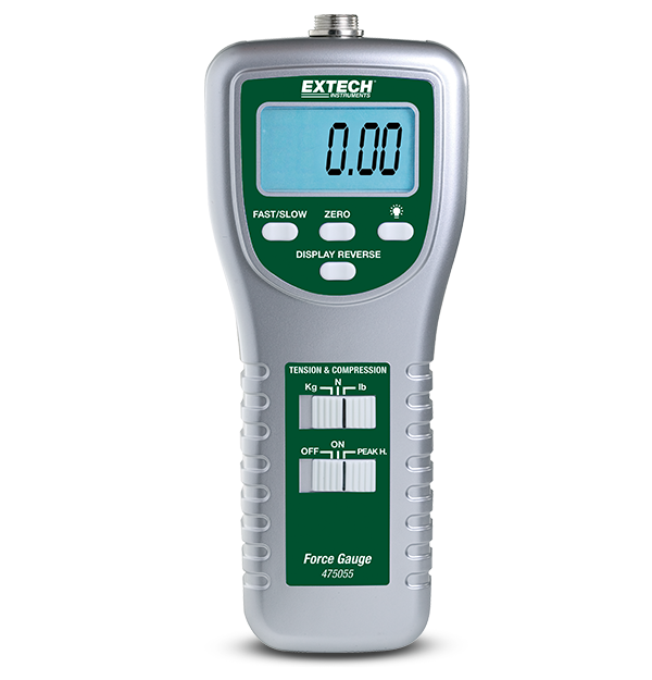 475055 is a High Capacity Force Gauge. Measuring ranges from 0.05 to 100-kilograms, 0.05 to 220-pounds, 0.2 to 980 Newton. Basic accuracy of 0.5-percent. Tension or Compression, Peak hold and Zero functions. Positive/Reverse display for easy readability. Large LCD with back light feature. Complete with tension and compression adaptors, 6 AA batteries and case.