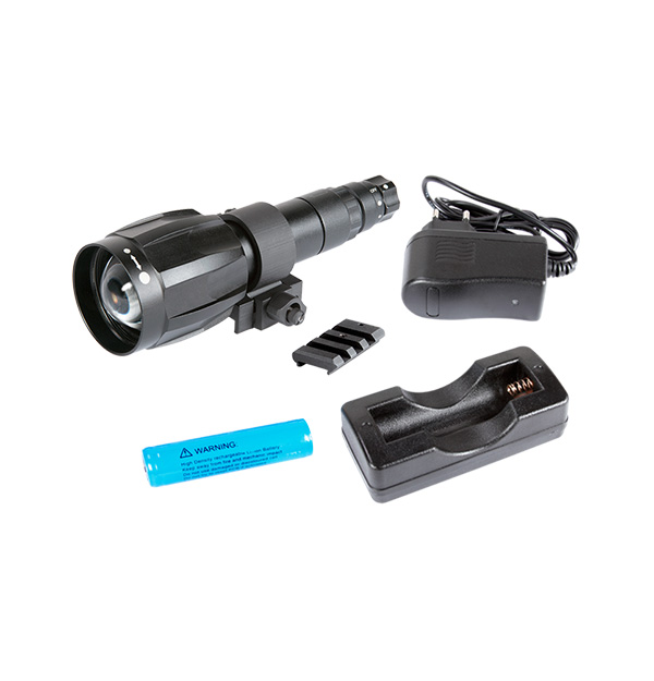 Night vision devices rely on small amounts of ambient light to capture clear imagery. FLIR’s Extra Long Range Infrared Illuminator uses near IR light invisible to the naked eye to covertly illuminate subjects in complete darkness, allowing night vision optics to produce a better image. The powerful IR850-XLR model offers beam angle adjustment and variable power control. Included rechargeable battery can operate up to 10 hours while an optional Afocal Doubler increases long-range performance. Includes the Dovetail to Weaver Transfer Piece, which is installed onto compatible devices for additional MIL-STD-1913/Weaver accessory mounting.