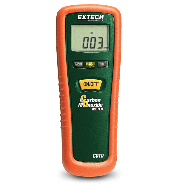 Checking carbon monoxide levels is as easy as pushing just one button with the Extech C010. This meter can measure CO levels up to 1,000 ppm with a resolution of 1 ppm and ±5% or ±10 ppm basic accuracy (whichever is greater). The CO10 sounds an alarm starting at 35 ppm that increases in speed at higher concentrations of CO. Above 200 ppm, the alarm will sound continuously. Additional features include a backlight on the display that can be used in low light areas, max hold, data hold, and auto-power-off. The meter comes complete with a 9-volt battery, protective holster, and case.