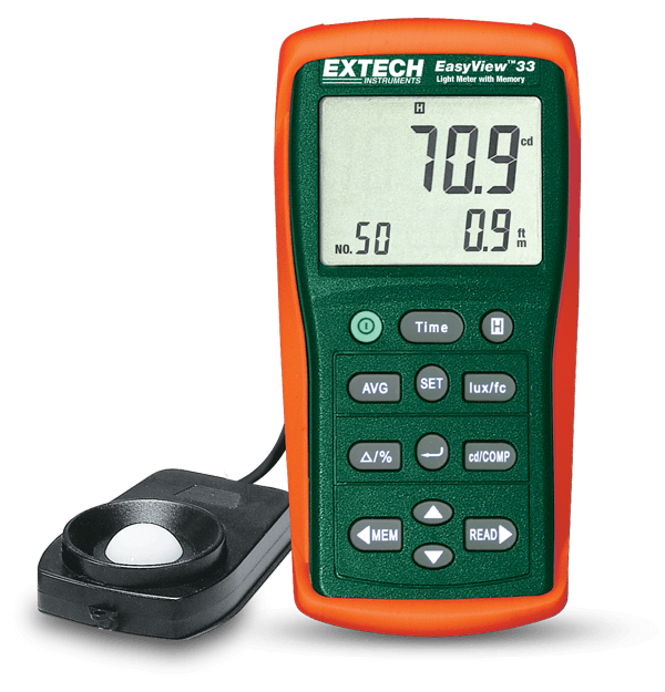 This compact and ruggedly designed meter has a wide measurement range to 99,990 Foot Candles in 5 ranges and 999,990 Lux in 5 ranges with 0.001Fc/0.01Lux resolution. Features include: Store and Recall up to 50 measurements with relative or real time clock stamp, Luminous intensity (candela) calculation, a ripple function that excludes stray light from the primary light source measurement, Multi-point average function, Timed Hold, Relative measurement in absolute value or % deviation, Comparator function with high/low alarms, and Auto Power Off with disable. Complete with built-in stand, light sensor and protective cover with 36” (0.9m) coiled cable, protective holster, 6 AAA batteries, and carrying case.