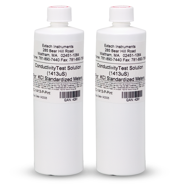 Extech EC-1413-P are two bottles of 1413 µS Conductivity Standard, 1 pint each of premade solution. EC-1413-P is for use with Extech conductivity meters like the EC400 ExStik Conductivity/TDS/Salinity Meter or DO610 ExStik II DO/pH/Conductivity Kit.