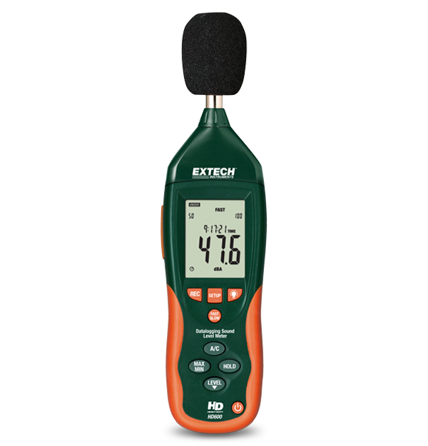 The Extech HD600 Datalogging Sound Level Meter meets ANSI and IEC 61672-1 Type 2 standards. It has three measuring ranges from 30 dB to 130 dB with ± 1.4 dB accuracy. In addition to the LCD digital display, an analog bargraph provides easy viewing of fast changing sound levels. The unit features a rugged double molded housing and a built-in stand. Meter comes with USB cable, Windows compatible software, windscreen, tripod, hard carrying case, 9 V battery, and user manual.