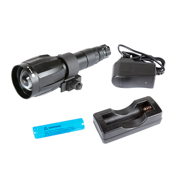 Night vision devices rely on small amounts of ambient light to capture clear imagery. FLIR’s Extra Long Range Infrared Illuminator uses near IR light invisible to the naked eye to covertly illuminate subjects in complete darkness, allowing night vision optics to produce a better image. The powerful IR850-XLR model offers beam angle adjustment and variable power control. Included rechargeable battery can operate up to 10 hours while an optional Afocal Doubler increases long-range performance.