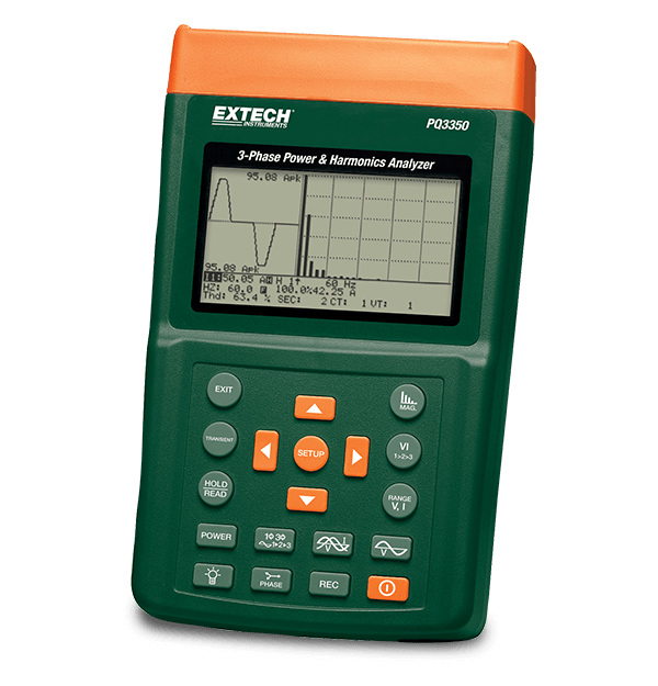 The Extech PQ3350 is a 3-Phase Power and Harmonics Analyzer made for single and 3-phase/3-wire or 3-phase/4-wire systems. The large, backlighting LCD displays up to 35 parameters in one screen. With the PQ3350, data log up to 52,428 single phase readings or 17,476 3-phase readings, and simultaniously display total harmonic distortion (THD-F) and waveform with peak values (1024 samples/period). Includes 4 voltage leads with alligator clips and retractable plunger clips, 8 AA batteries, universal AC adaptor, software, USB interface cable, and case. Current Probes sold separately.